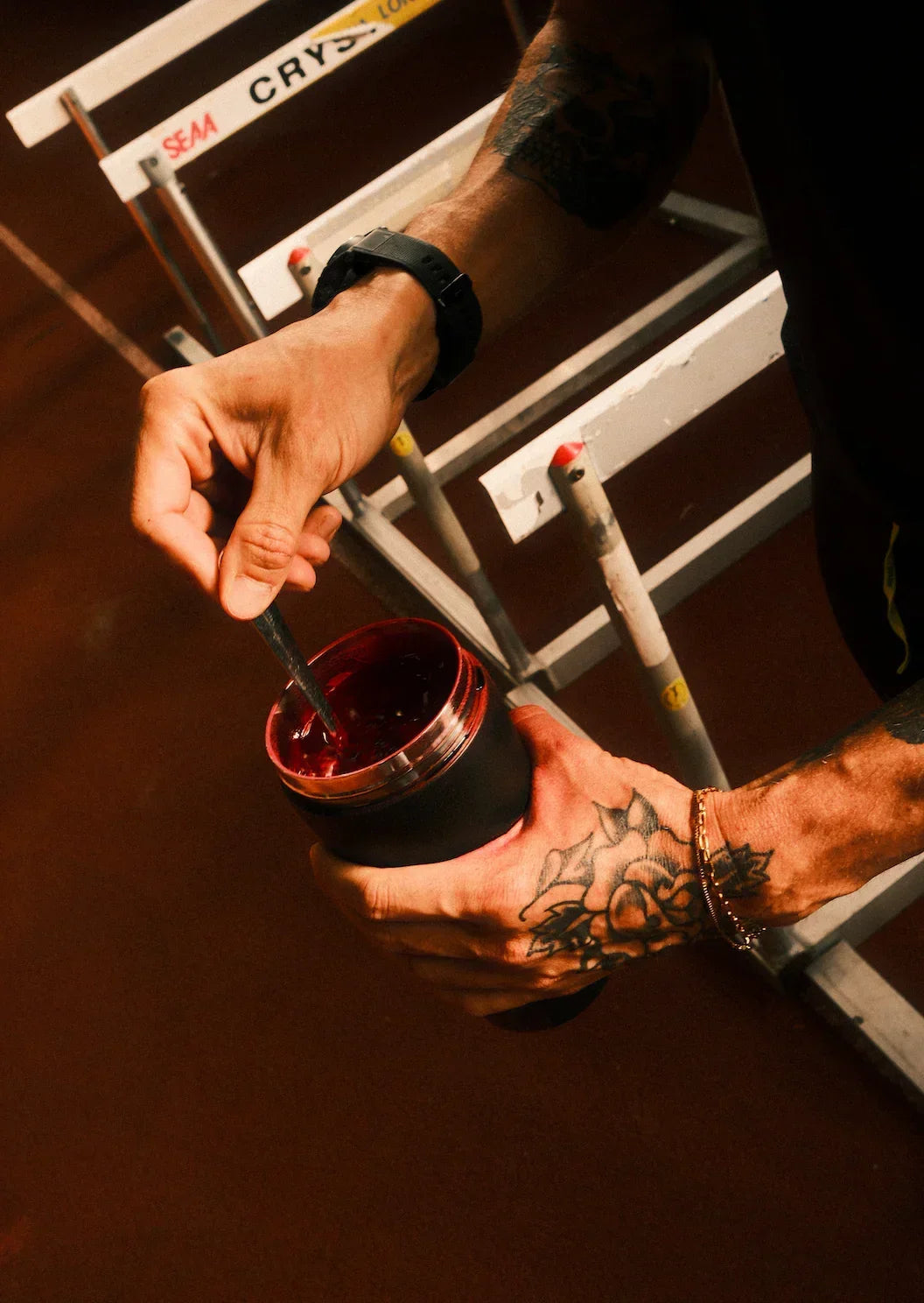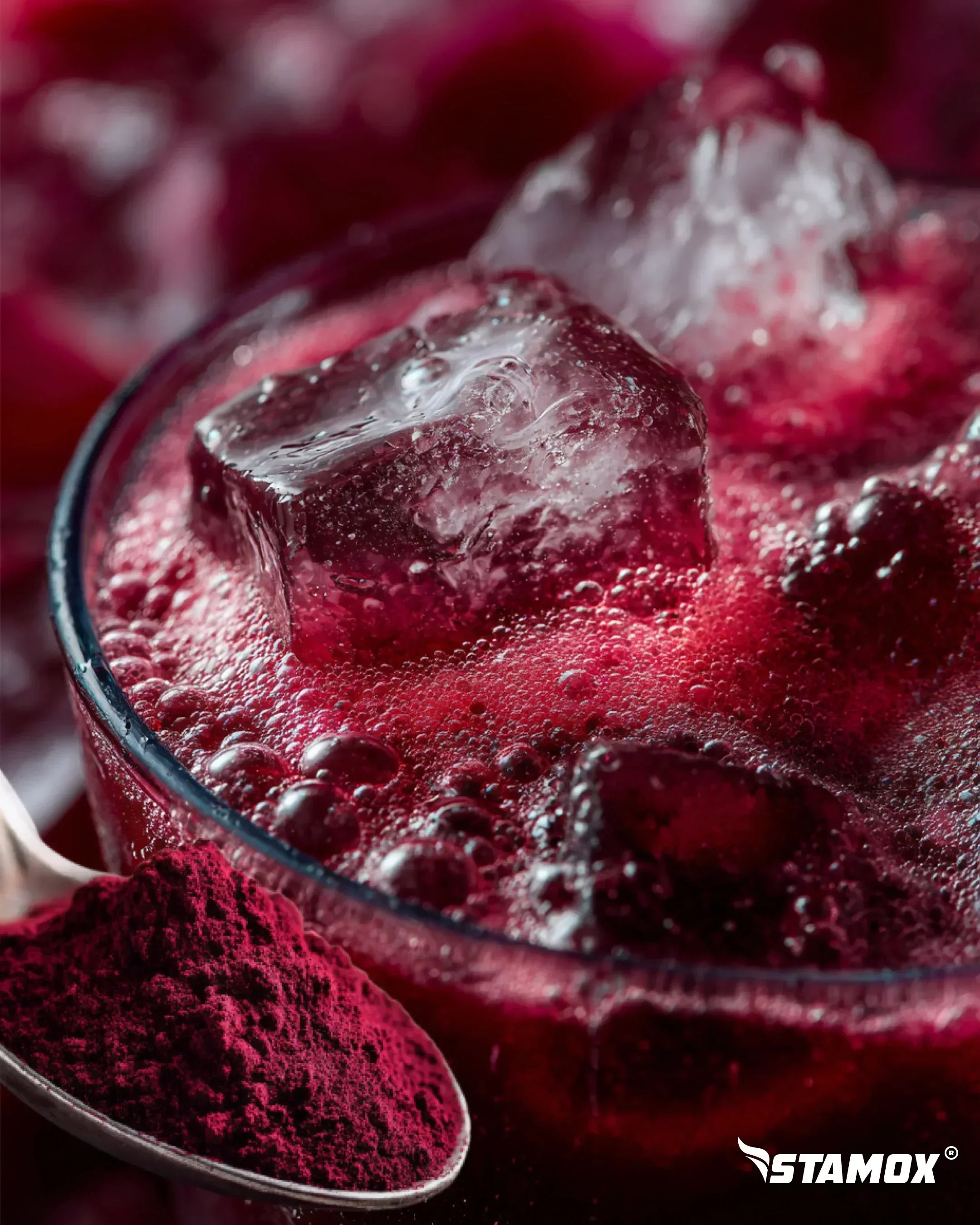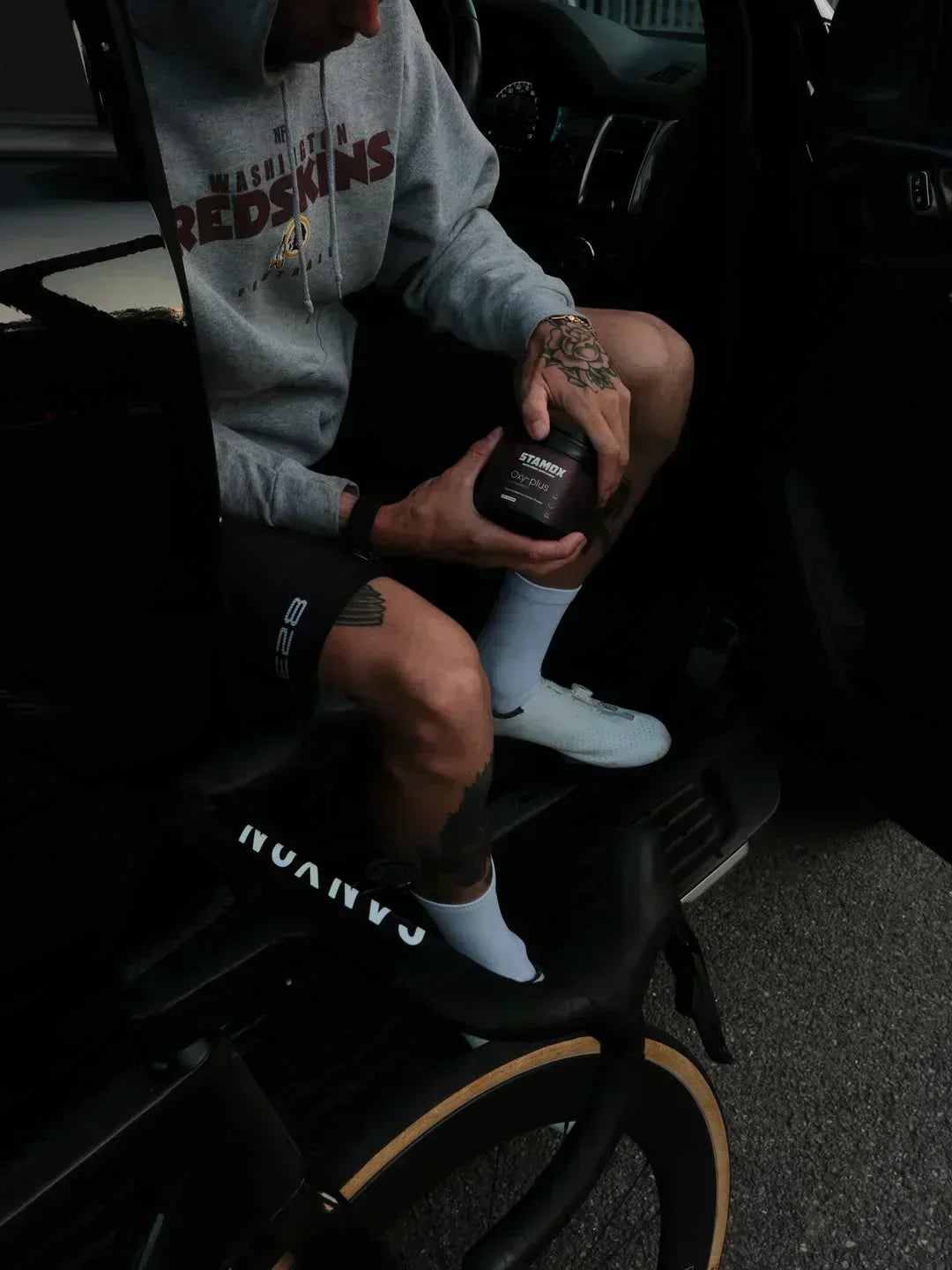 Cyclist riding outdoors, promoting stamox beetroot powder for endurance and power